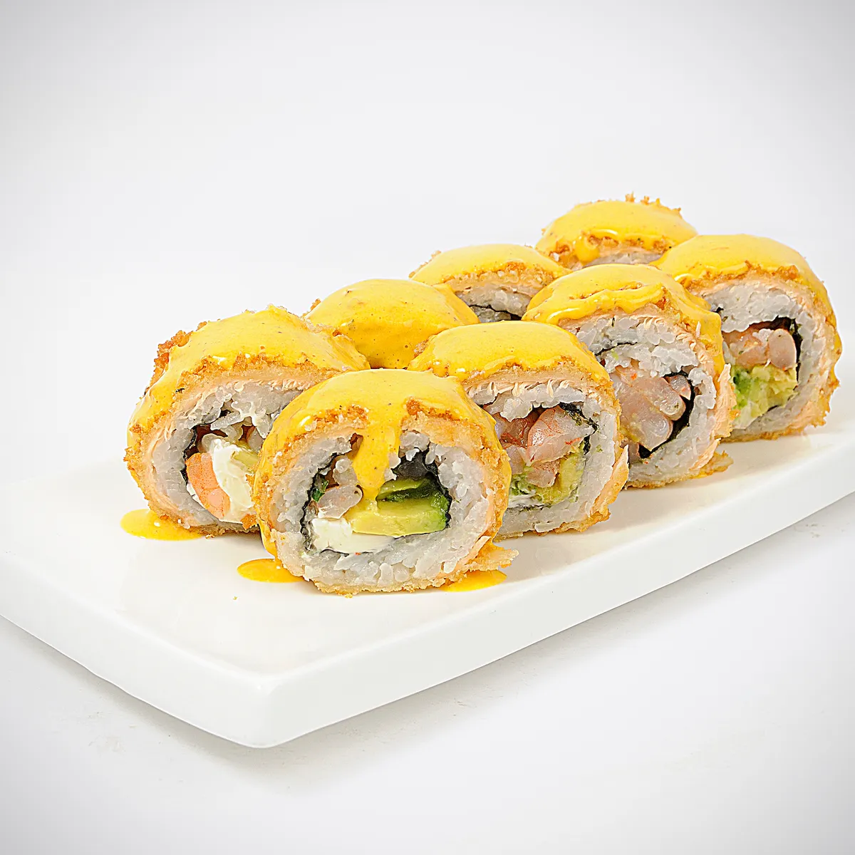 10 piezas de Camarón, queso crema, cebollín, ají verde envuelto en panko.