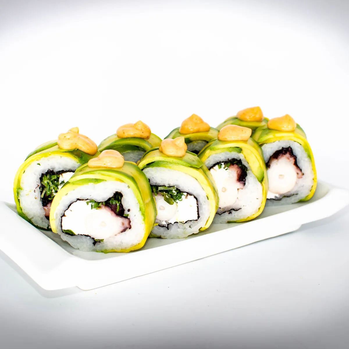 10 piezas de Camarón, palta, queso crema, cebollín envuelto en atún, salmón y palta.